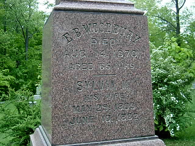 Ebenezer Boswell Woodbury was born Jul 16, 1805 in New Hampshire and died Aug 19, 1870 in Jefferson, Ashtabula Co, Ohio. He is buried in Oakdale Cemetery, along with his wife, Sylvia Benson, who is the daughter of Stutson Benson, Jr and Sarah Sumner. Sylvia was born May 29, 1809 in Pompey, Onondaga Co, New York and died Jun 10, 1882 in Jefferson, Ashtabula Co, Ohio. |