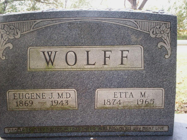 Eugene Wolff was born in Missouri on Aug 1869 and died in 1943. He married Annetta "Etta" Miriah Powers about 1896. She was born Dec 1874 in Clinton, Henry Co, Missouri and died July 28, 1965 in Waukomis, Garfield Co, Oklahoma.