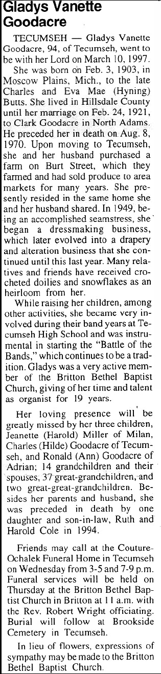 Gladys (Butts) Goodacre was born Feb 03, 1903 in Hillsdale Co, Michigan and died Mar 10, 1997 in Tecumseh, Lenawee Co, Michigan.