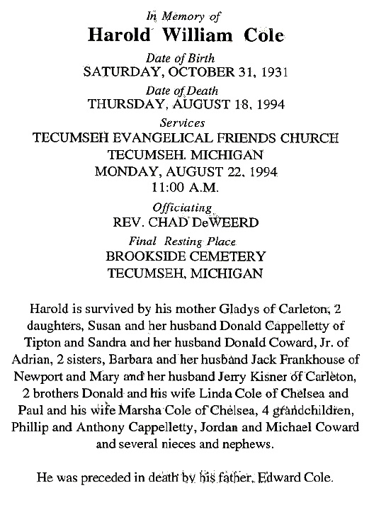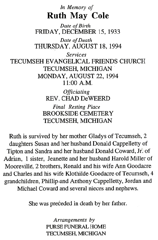 Ruth Goodacre was born Dec 15, 1933 in Tecumseh, Lenawee Co, Michigan and died Aug 18, 1994 in Britton, Lenawee Co, Michigan. She married Harold Cole.