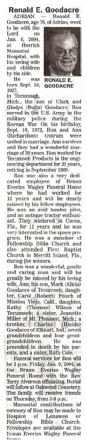 Ronald Goodacre was born Sep 10, 1927 in Michigan and died Jan 06, 2004 in Adrian, Lenawee Co, Michigan