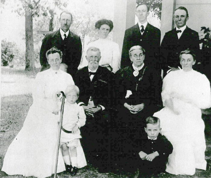 Ira W. and Mary Jane are seated in the center. Their daughter, Ida, is seated on the left. Her husband, George Hursh stands behind her, with their daughter-in-law, Minnie Ila (SMITH) and Ida's son (from her 1st marriage), Lewis Wells BAILEY, standing in the center. Ira and Mary's other daughter, Edna, is seated on the right, with her husband, James Seward Matthewson, standing behind her. It is certain that the boy holding Ira's cane, is Gerald B. HURSH, b. 1901. He stands in front of his mother, Ida. The boy, on the right, would certainly be Arden S MATTHEWSON b. 1898, sitting in front of his mother, Edna (BELL) MATTHEWSON.