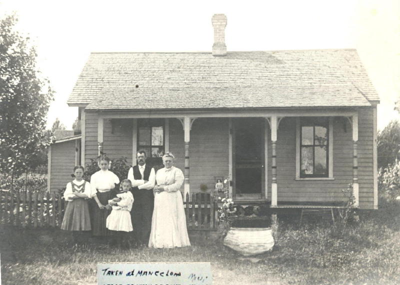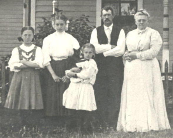 Edward & Alice (Saxton) Thorne and daughters, Mary Elizabeth (Mae), Bessie and Lenna. Taken at Mancelona township, Antrim Co, Michigan. Photo probably taken about 1906. Photo courtesy of Delores Kimling.