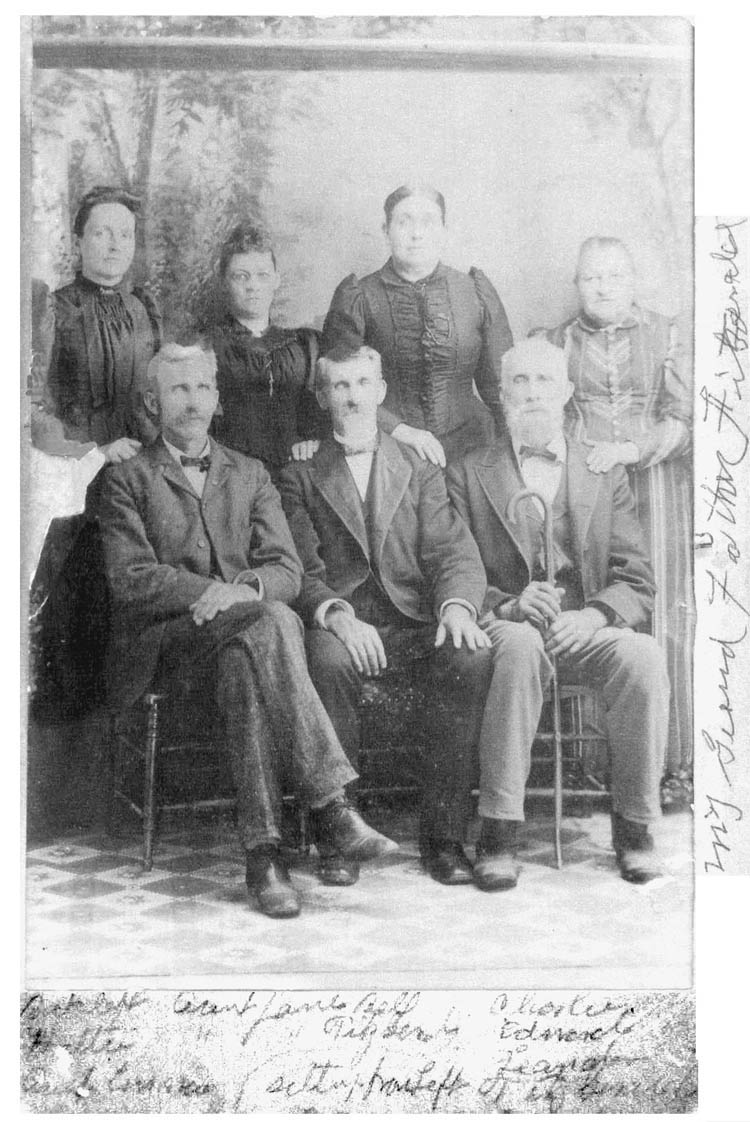 Standing Left to Right: Hattie (Houghton) Fitzgerald 1856-1894, Emma (Shepard) Fitzgerald 1844-1911, sister Mary Jane (Fitzgerald) 1837-1909 and probably 2nd wife of Leander, Sarah (White) Fitzgerald b. 1835.
