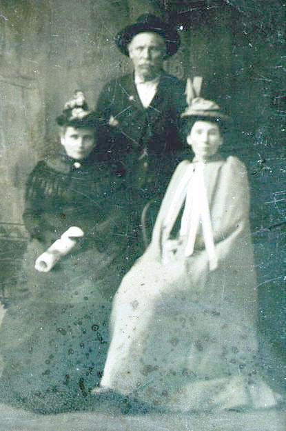 She writes... "This photo is not labled on the back because it is a tin type. However, my Mom and I both think it is probably James Edwards Fitzgerald. If you compare this photo with the one I am sending with Mary, Charles and girls, you will see how much Charles and this man look alike. (compare features) Since it is a tin type we know it is old and it was in a box with all of the pictures of Helen Fitzgerald's family. She had pictures of her mother's Mom and Dad and the picture of Mary and this one. That makes me think it is James. However, I think we need to put a question mark on that one unless someone else can verify."