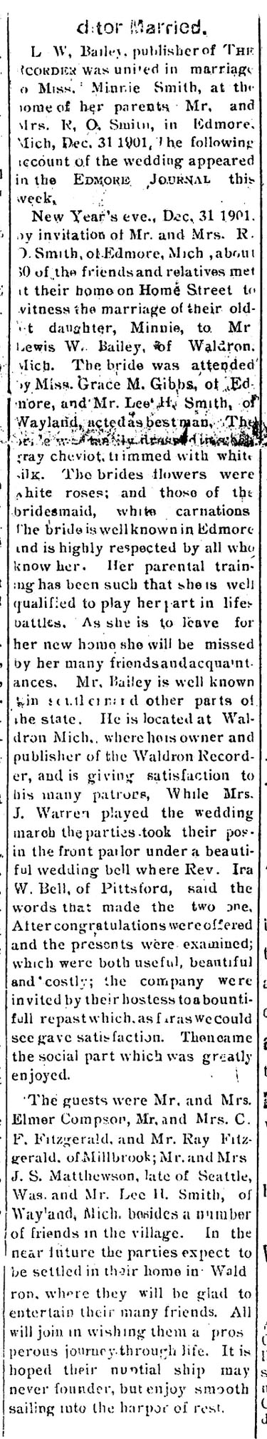 EDITOR MARRIED New Year's eve., Dec. 31, 1901, by invitation of Mr. and Mrs. R. O. SMITH, of Edmore, Mich, about 60 of the friends and relatives met at their home on Home Street to witness the marriage of their oldest daughter, Minnie, to Mr. Lewis W. BAILEY, of Waldron, Mich. The bride was attended by Miss Grace M. GIBBS, of Edmore, and Mr. Lee H. SMITH, of Wayland, acted as best man. The (illegible) dressed (illegible) gray cheviot, trimmed with white silk. The brides floowers were white roses: and those of the bridesmaid, white carnations. The bride is well known in Edmore and is highly respected by all who know her. Her parental training has been such that she is well qualified to play her part in life battles. As she is to leave for her new home, she will be missed by her many friends and acquaintances. Mr. BAILEY is well known (illegible) other parts of the state. He is located at Waldron Mich, where h is owner and publisher of the Waldron Recorder, and is giving satisfaction to his many patrons. While Mrs. J. WARREN played the wedding march the parties took their pos- in the front parlor under a beautiful wedding bell where Rev. Ira W. BELL, of Pittsford, said the words that made the two one. After congratulations were offered and the presents were examined; which were both useful, beautiful and costly; the company were invited by their hostess to a bountiful repast which, as far as we could see, gave satisfaction. Then came the social part which was greatly enjoyed. The guests were Mr. and Mrs. Clmer COMPSON, Mr. and Mrs. C. F. FITZGERALD, and Mr. Ray FITZGERALD, of Millbrook; Mr. and Mrs. J. S. MATTHEWSON, late of Seattle, Was. and Mr. Lee H. SMITH, of Wayland, Mich., besides a number of friends in the village. In the near future the parties expect to be settled in their home in Waldron, where they will be glad to entertain their many friends. All will join in wishing them a prosperous journey through life. It is hoped their nuptial ship may never founder, but enjoy smooth sailing into the harbor of rest. Courtesy of Delores Kimling, obtained from District Library, Waldron, Michigan