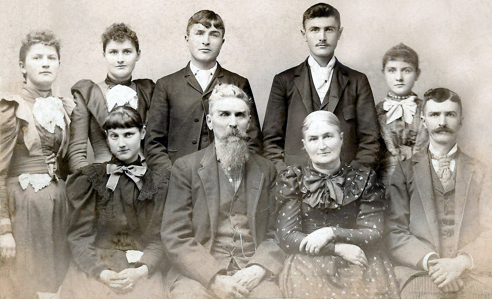 Front Row, left to right: 6) Mary E Scovill, 7) father Ransom C Scovill, 8) mother Adalaide (Fuller) Scovill, 9) Alfred William Scovill.