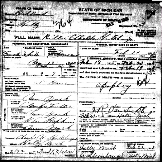 Rillie Fuller Hutchings died Feb 20, 1915 in Holly, Oakland Co, Michigan, where she is buried.