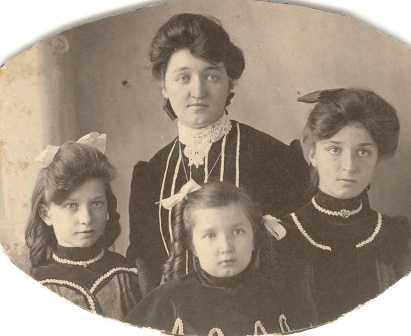 Zora Bell Hatch with sisters, left to right: Leah Golden Hatch, Violet Verdeen Hatch and Olca Leola Hatch. Photo from Maxine (Armstrong) Wyatt