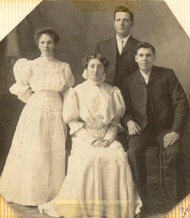 Zora was born Jun 15, 1882, the daughter of Frederick Lavern and Winnie (Hukill) Hatch. She married Arthur Edwin Armstrong on Nov 30, 1905. Attendants were Jenny & Tom Armstrong, brother of Edwin, standing behind the bride and groom.