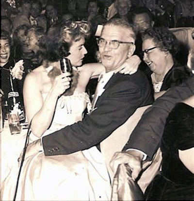He's clearly misbehaving, as his wife, Margaret Agnes Donahue Sargent is the woman to his right, looking away and laughing while he flirts with the entertainment. This was a company dinner.