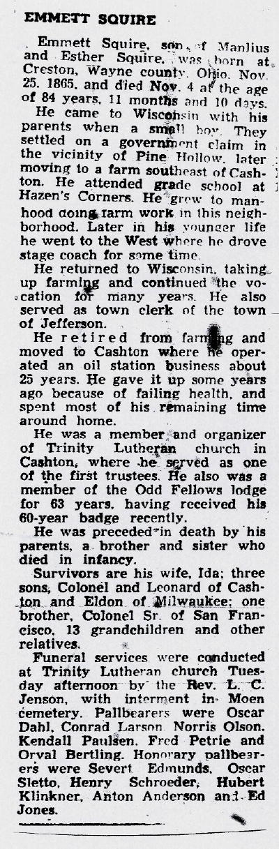 Emmet P Squires was born Nov 25, 1865 in Wayne Co., Ohio to Manlius Squires and Esther Stanton. Around 1890, he met Pluma Love, the daughter of Albert Love and Abby D Scoville. Together they had Birdie Doris Squires about 1891 in Nebraska. Outside influences kept them from marriage, so Emmet eventually married Jessie Kleinbouer October 1, 1892 in Juneau Co., Wisconsin, the daughter of Michael and Josie Kleinbauer. Nothing more is found on "Jessie", however, "Julie Kleinbauer", daughter of Michael and Josie Kleinbauer was born 1876 and died in 1894. If, in fact, his wife died in 1894, it was 10 years before Emmet Squires married again. In abt. 1904 in Wisconsin, he married Casilda Matilda Drawer, born in Germany in 1931. This marriage produced 3 children before Emmet lost this third partner. Casilda died in 1931 in Wisconsin, survived Emmet and three sons; Colonel E Squire b. abt. 1905; Seth Eldon Philip Squire b. Mar 07, 1906; and Leonard H Squire born in 1910 and died Aug 14, 1966 in Madison, Dane Co, Wisconsin. About two years later, on Aug 15, 1933, Emmet Squire married a third time to Ida (McClellan) Tanner. She was born Dec 20, 1867 in Hillsdale Co, Michigan. The marriage took place in Steuben Co, Indiana. Emmet died Nov. 4, 1950 and is buried in Cashton, Monroe Co, Wisconsin's Meon cemetery.