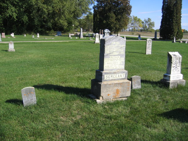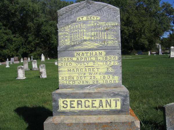 Nathan Sargent (spelled Sergeant) was born Apr 08, 1834 in Brandon, Rutland Co, Vermont, the son of Timothy C. and Mercy (Church) Sargent. He married Margaret Wood on Aug 23, 1860 in DeKalb Co, Illinois. He died Jul 21, 1925 and is buried in Evergreen Cemetery, Rudd, Floyd Co, Iowa. To the left of their tombstone, is "Mercy" and to the right is "Mother".