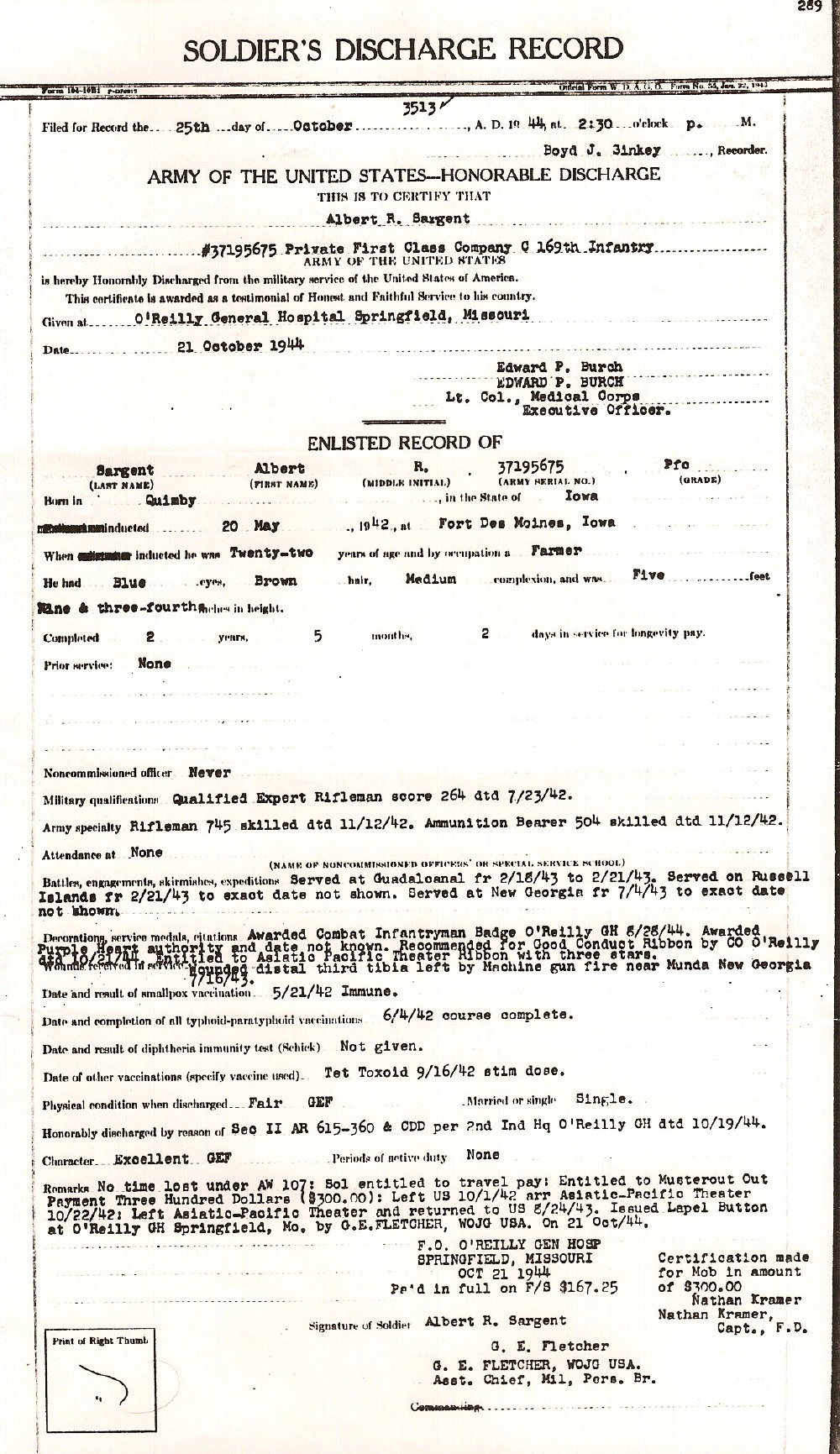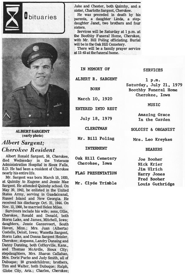 Albert Ronald Sargent was born Mar 10, 1920 in Quimby, Cherokee Co, Iowa, to Eugene and Jessie May Sargent. He served his country in the U. S. Army during WWII, married twice and had seven children, before his death on Jul 18, 1979, in Sioux Falls, South Dakota.