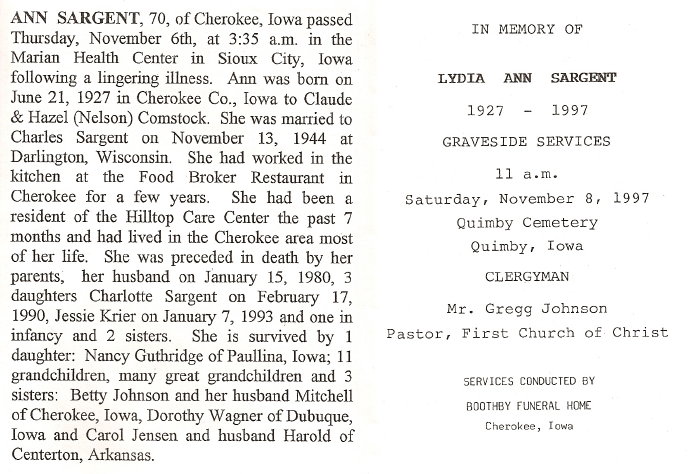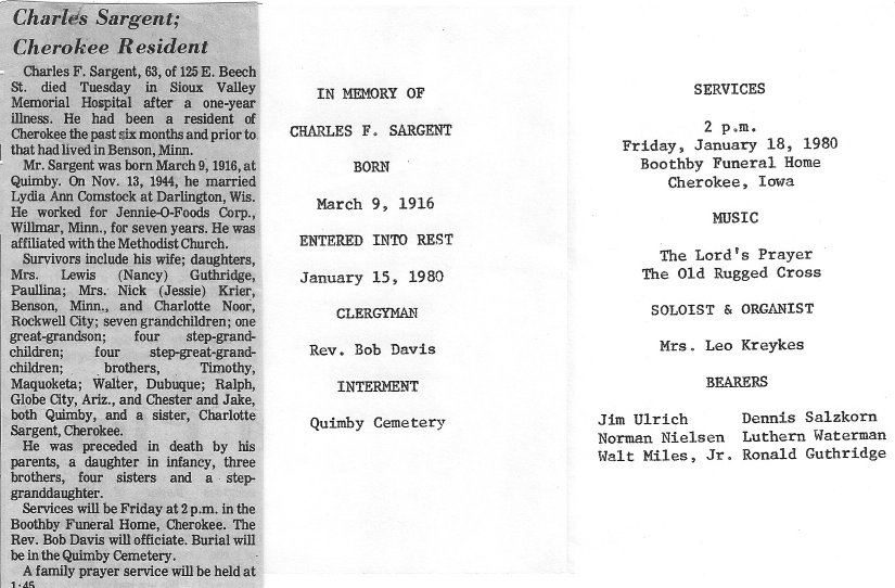 Charles Franklin Sargent was born Mar 09, 1916 in Quimby, Cherokee Co, Iowa, the son of Eugene and Jessie May (Huston) Sargent. He married Lydia Ann Comstock on Nov 13, 1944 in Darlington, Lafayette Co, Wisconsin, and had four children, before he died in Quimby on Jan 15, 1980. Photo taken in 1958.