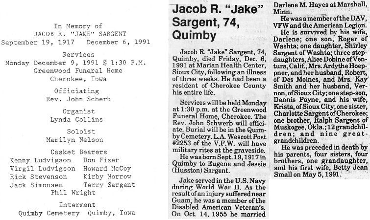 Jacob Roger Sargent was born September 19, 1917 in Quimby, Cherokee Co, Iowa, to Eugene and Jessie May Sargent. He served his country in the U. S. Navy, married twice and had two children, before his death on December 6, 1991. Pictured here with his niece, Cora Soules.