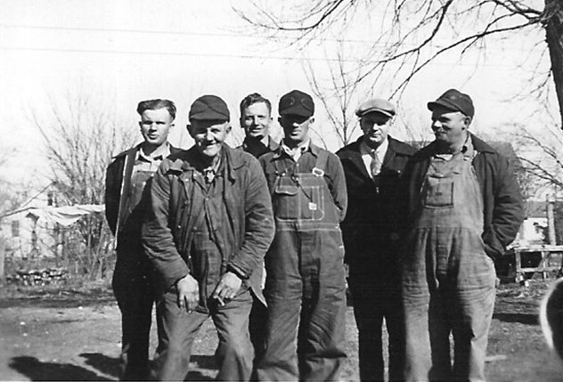 L. to R. - Chester Sargent b. 1908, father Eugene Sargent b. 1873, Timothy Sargent, b. 1913, Jacob Sargent b. 1917, Mel Cosier, husband of Mable Sargent, and LESTER SARGENT b. 1901.