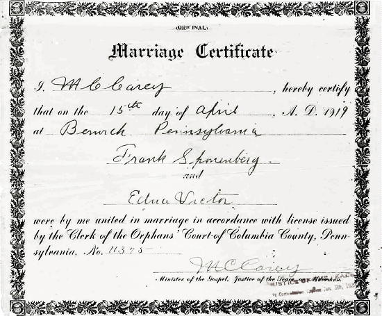 Frank Sponenberg Marriage License Frank Sponenberg's second marriage took place on Apr 15, 1919, in Berwick, Pennsylvania, to Edna Victor
