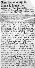 Olen C. Sponenberg, of 1606 Fairview Avenue, Berwick, Penna., has been promoted to the grade of corporal, accoring to a recent announcement by the Army Airways Communication System, of which he is a member. Cpl. Sponenberg is on duty as an AACS Airways radio operator somewhere in Greenland, where he maintains radio contact with military aircraft in flight. In this capacity he handles position reports, arrival and departure notices, and furnishes pilots with countless details and information necessary to make military flying safe and efficient.