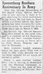 Tech Sgt. George Sponenberg of the Signal Corps Special Service, who is now serving in Italy, is today observing his third anniversary in the Army. He had been in North Africa and Sicily before Sgt. Sponenberg has been overseas for twenty-two months. He joined the Army three years ago on March 3, 1942.