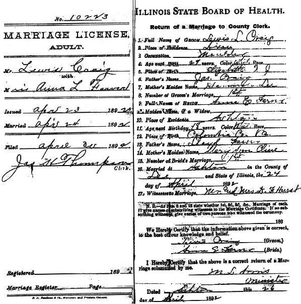 Lewis L. Craig and Anna L Farver were marrried in Ashton, Lee Co, Illinois on April 24, 1892 Witnesses Mr. and Mrs. D.F. Hurst