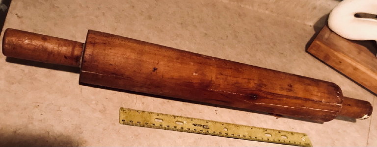 This really big rolling pin, approximately 26 inches, was made for Yelena (Helen) by a friend, before she left Yugoslavia in 1921. She was 19 years old. It must have had special meaning for her to include it in her baggage, as she was traveling alone and nine months pregnant. It was passed down in her Nokovich family, and is now in the posession of her great granddaughter, Amanda.