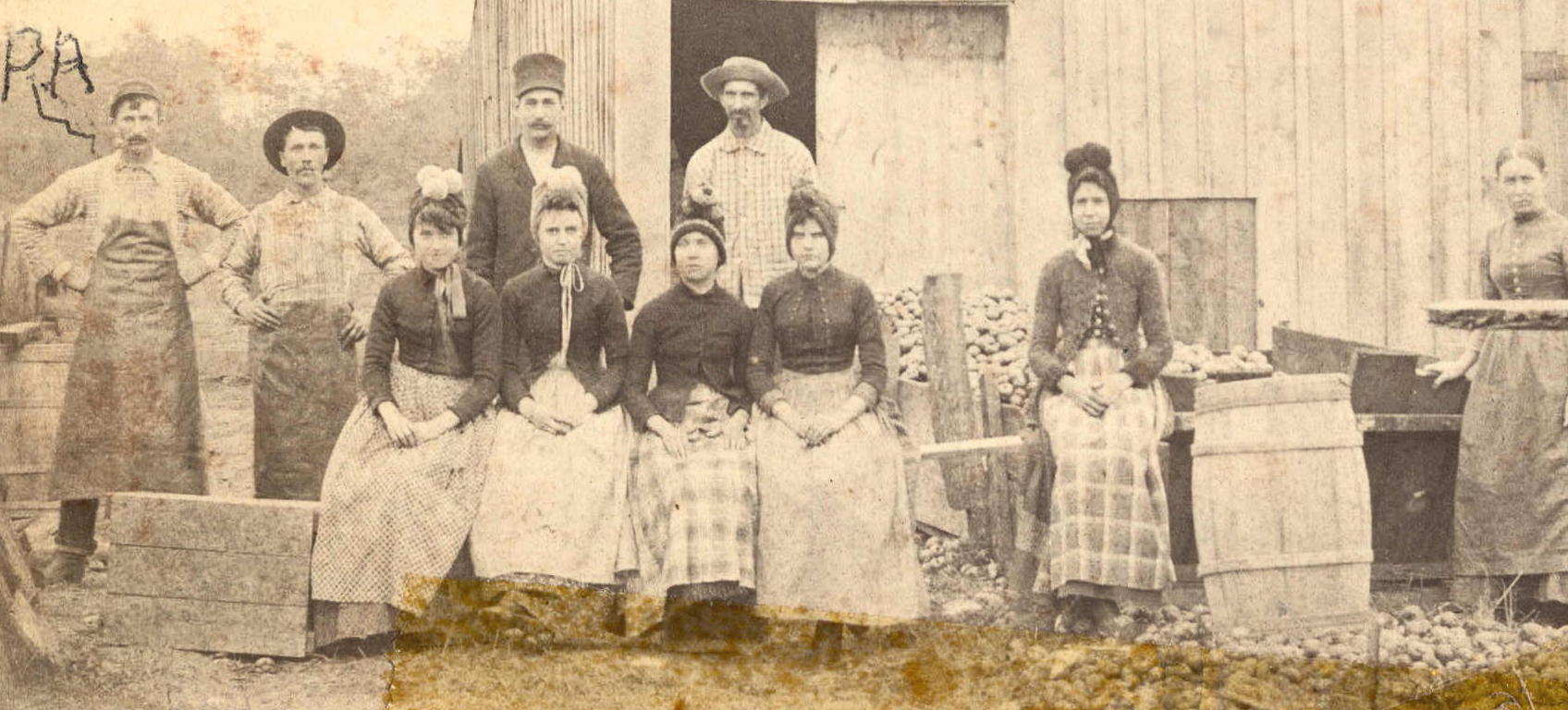 Back of Picture: "The old apple dryer in 1894. Dad & Uncle Charley, Aunt Erma? or (Emma), Lyde and Aunt Ella - Hattie Felix, Miriam(?) Hinkeles(?) or Hillkels(?), and Hattie Freed. Dad is about 32 years old here."